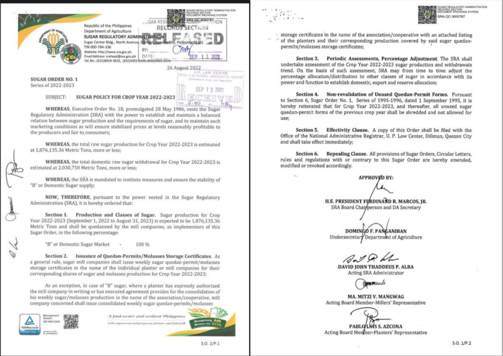 Meanwhile, signatories included Marcos, as well as Agriculture Undersecretary Domingo Panganiban, Acting SRA Director David Thaddeus Alba, and Acting Board Member-Millers’ Representative Ma. Acting Board Member-Planters’ Representative Pablo Luis Azcona and Mitzi Mangwag
