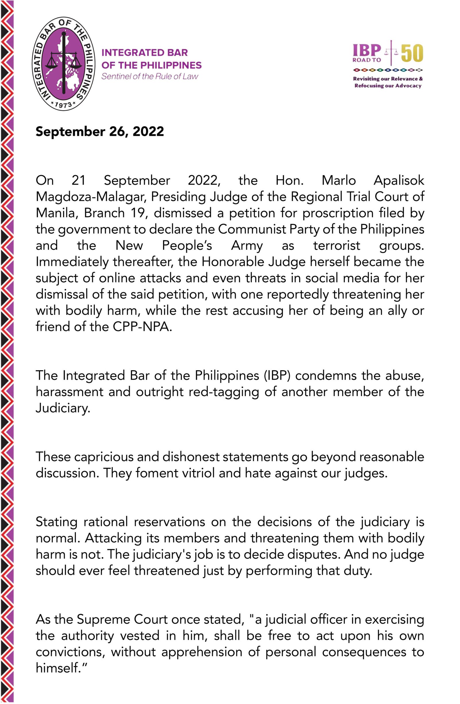“On September 21, 2022, the Honorable Judge Marlo Apalisok Magdoza-Malagar of the Regional Trial Court of Manila, Branch 9 dismissed a petition for proscription filed by the government to declare the Communist Party of the Philippines and the New People’s Army as terrorist groups. Immediately thereafter, the Honorable Judge herself became the subject of online attacks and even threats in social media for her dismissal of the said petition, with one reportedly threatening her with bodily harm, while the rest accusing her of being an ally or friend of the CPP-NPA,” the IBP statement read.