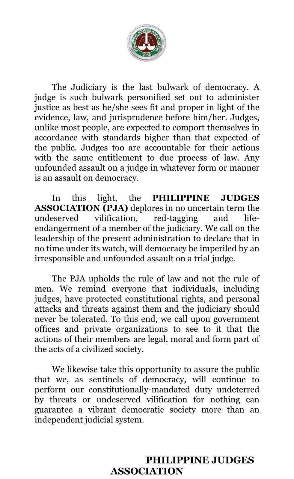 The PJA also went on to call on the government to “declare that in no time under its watch, will democracy be imperiled by an irresponsible and unfounded assault on a trial judge.”