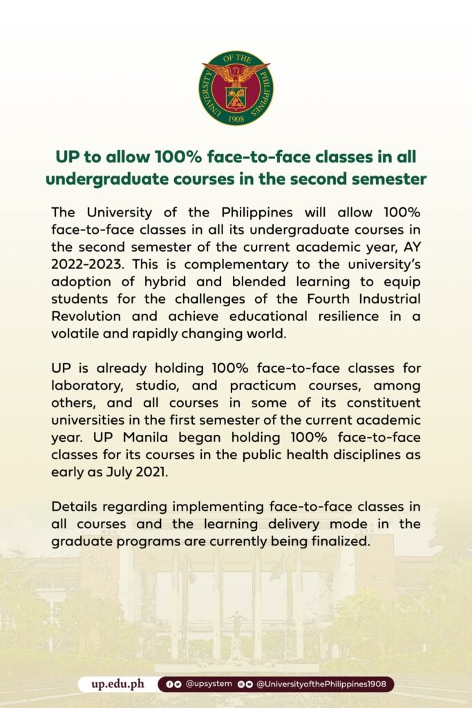 The University of the Philippines (UP) announced on Thursday that it would allow 100% in-person classes in all undergraduate programs for the second semester of Academic Year (AY) 2022-2023.