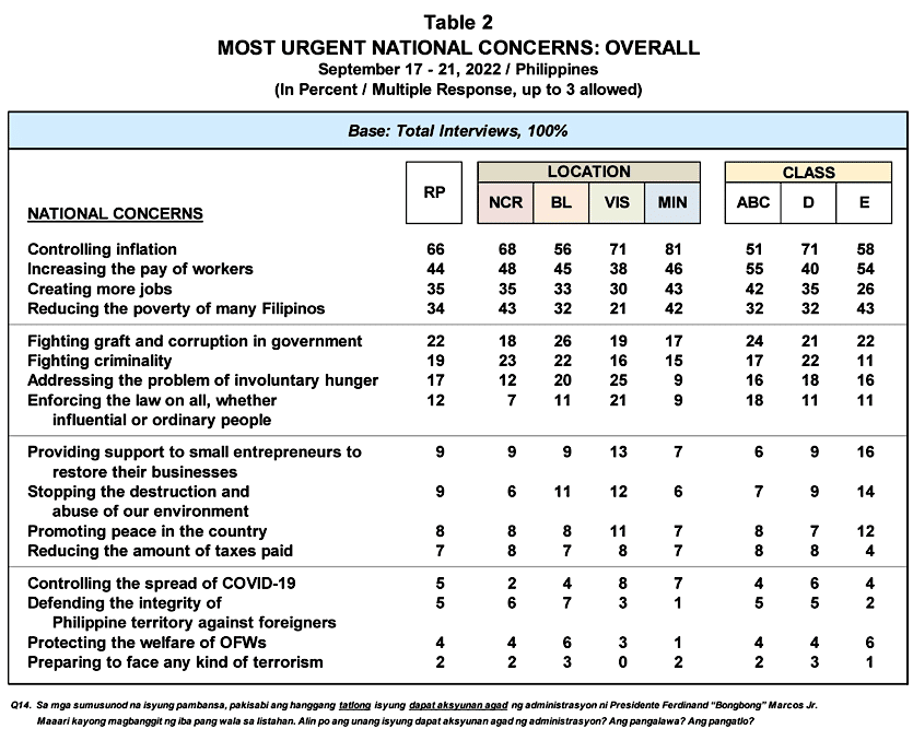 “The level of concern about controlling inflation—the only national issue considered urgent by most adults (66 percent)—increases (+9 percentage points) while concern about creating more jobs also becomes more pronounced (+6 percentage points). In contrast, public concern regarding peace promotion in the country eases during the same period (-6 percentage points),” it said.