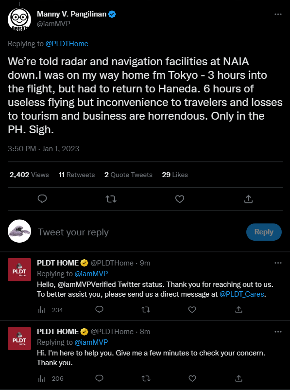 In his next tweet, Pangilinan offered to help the DOTr and CAAP with technical matters such as required connectivities and redundant power supply protection. This apparently did not sit well with PLDT and Smart subscribers, who tweeted back with personal experiences of poor connectivity and unreliable service. Many also complained of irregular water supply from another Pangilinan business holding, Maynilad Water Services.