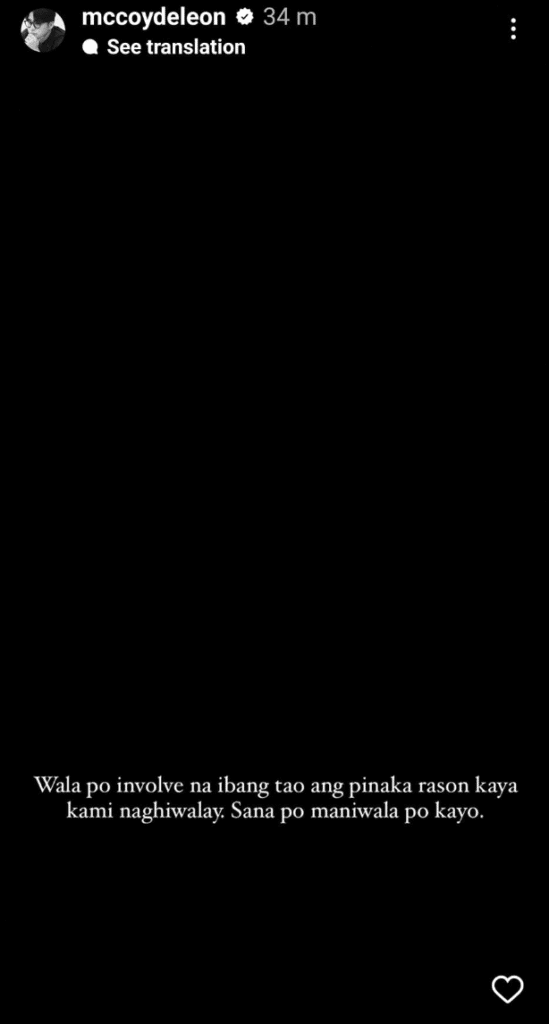 “Wala pong [involved] na ibang tao [sa] pinaka rason kaya kami naghiwalay. Sana po maniwala po kayo,” he wrote in the IG Stories, which were publicly visible for several hours.