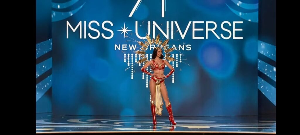 The most swoon-worthy twist happened during the national costume competition, when Cortesi entered the stage wearing the costume of Philippine superhero Darna. Sporting Darna’s characteristic red and gold bikini and boots, Cortesi a golden backpiece in the form of the Philippine sun to the ensemble to make it stand out.