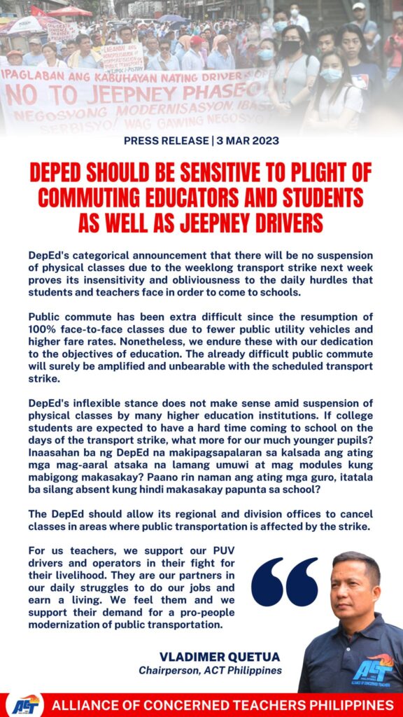 Quetua said that Duterte should open her eyes to the reality that “our schools, teachers, and students do not live in a vacuum…Many of our students and teachers have family members who are PUV drivers who are about to lose their livelihood. Our difficult realities and the scantiness of government funding for education are the real serious impediments to education recovery, so much more than the coming transport strike.”